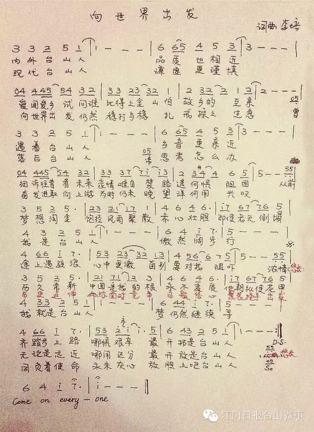 经多方打探,这是一首本土原创歌曲,又名《向世界出发》,由祖籍台山的歌手周游格演唱。词曲作者李培先生,是一位公务员,台山某局的副局长(不要这么低调好不好)!