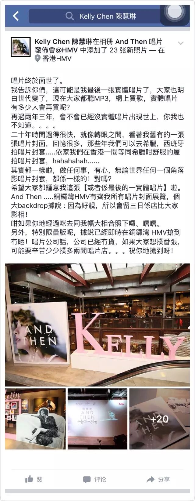 这次新碟《And Then》推出2,000张特别版,陈慧琳已存了一张。陈慧琳上一次出碟已经是三年前,表示现今唱片业市道低迷,这次可能是最后一张十首歌的专辑。