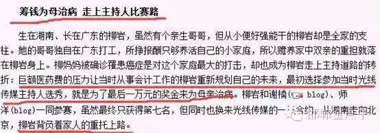 上天没有给柳岩一个好出身,但至少给她留了"身材好"这一扇窗。于是17岁时,柳岩参加了广州的一个模特比赛,进入到复赛时就被广州电视台看中,以主持人的身份进了电视台,之后参加湖南星姐选举,进入湖南公共频道做主持人。