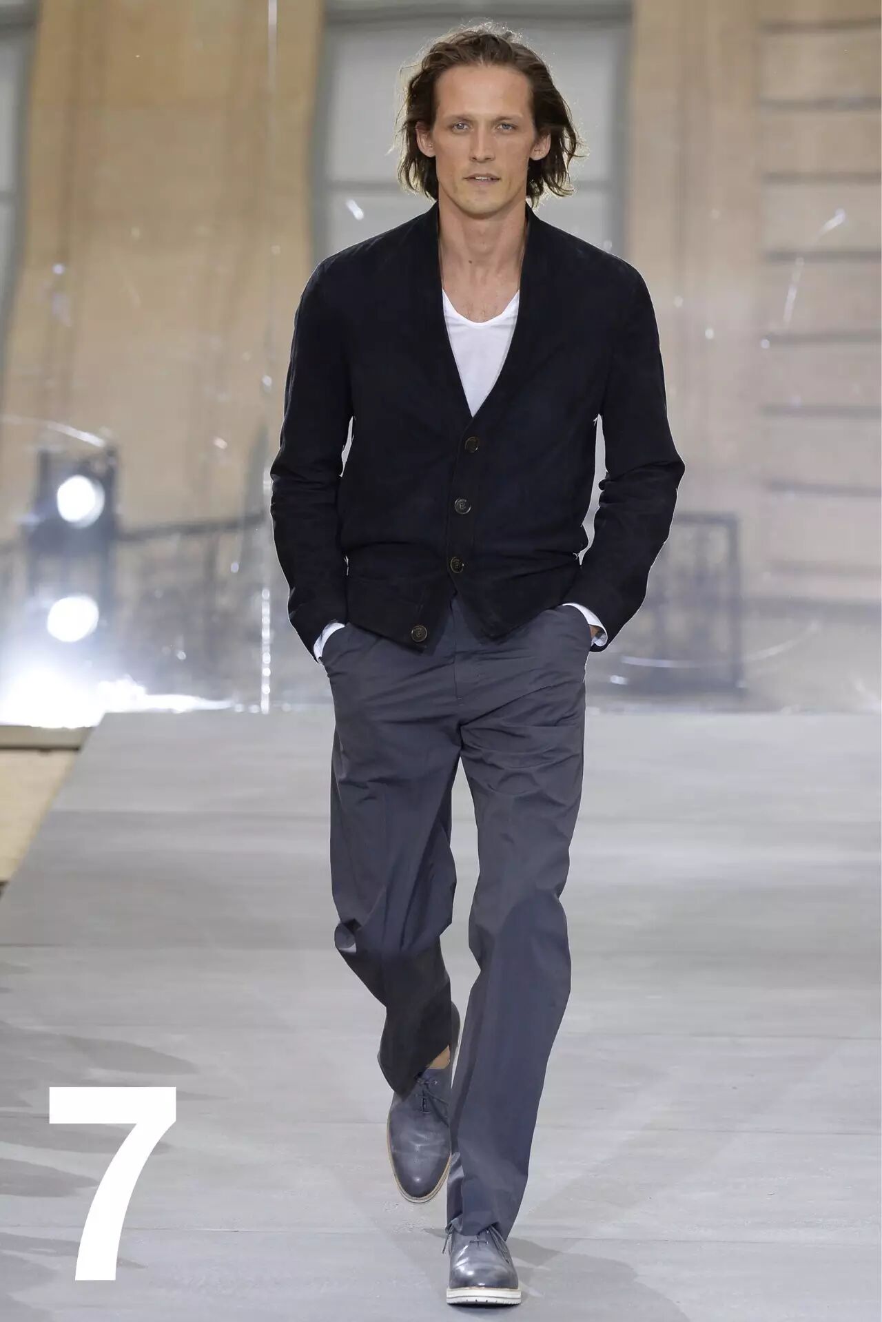 来自时装助理郭哲:你是否发现,那些花里胡哨的潮流单品买再多,你穿得最勤的始终是最简单的款式;就像 Berluti 秀上这样,一件白 T 恤一件麂皮外套,足够简单,却是最考验衣服本身的品质,更是考验你的个人魅力。