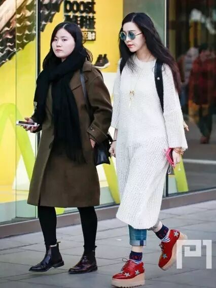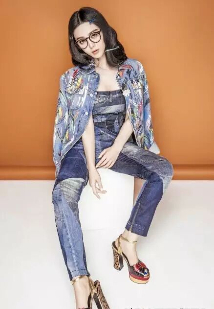 虽然范冰冰用长款毛衣搭配的牛仔裤,但是挽起裤脚搭配厚底鞋显高的效果还是不错~