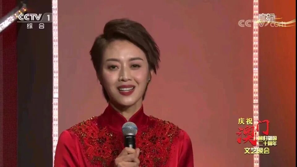 演员范志博短发红裙亮相澳门回归20周年庆典,首次主持紧张又可爱的晚会。