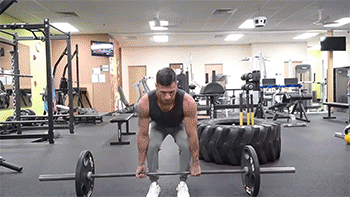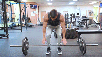 让杠铃杆贴着小腿,双脚与髋同宽站立,腰背部挺直,屈髋屈膝俯身,抓住杠铃,髋部向前推,起身拉起杠铃至身体直立,起身过程中背部不要出现曲度变化。