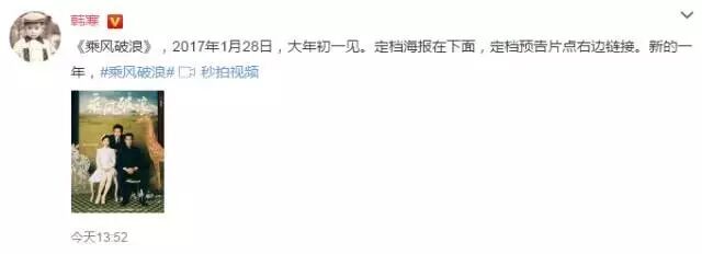 所以《乘风破浪》电影正式定档2017年大年初一,当有记者问到为何选择在竞争激烈的档期上映时,韩寒才能这么自信地说: