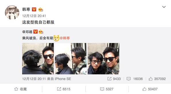 12月27日,作为主持人的韩寒直接在《乘风破浪》发布会上控诉邓超,怎么能把这款蜜汁造型发到微博上去呢?让迷妹们看到影响多不好呐!
