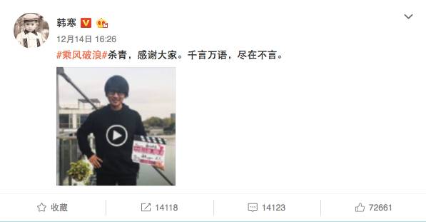 因为,别人电影都是杀青就杀青,由韩寒执导,邓超、彭于晏、赵丽颖等人主演的电影《乘风破浪》杀青时,韩寒微博却发了这样一张配图!照片上他身着一件黑色卫衣,胸前一个大大的圆圈套三角符号,像极了视频播放按钮的图标。
