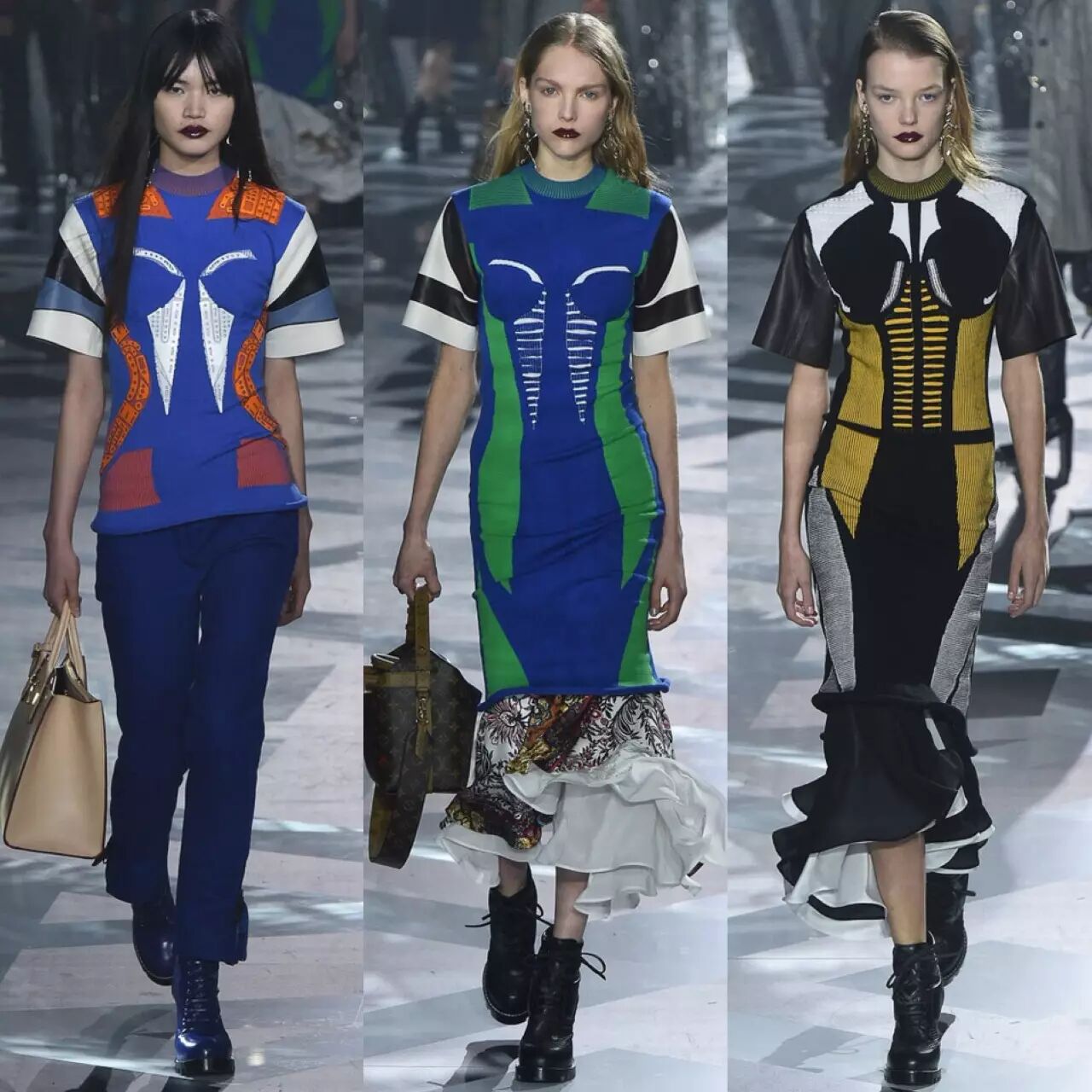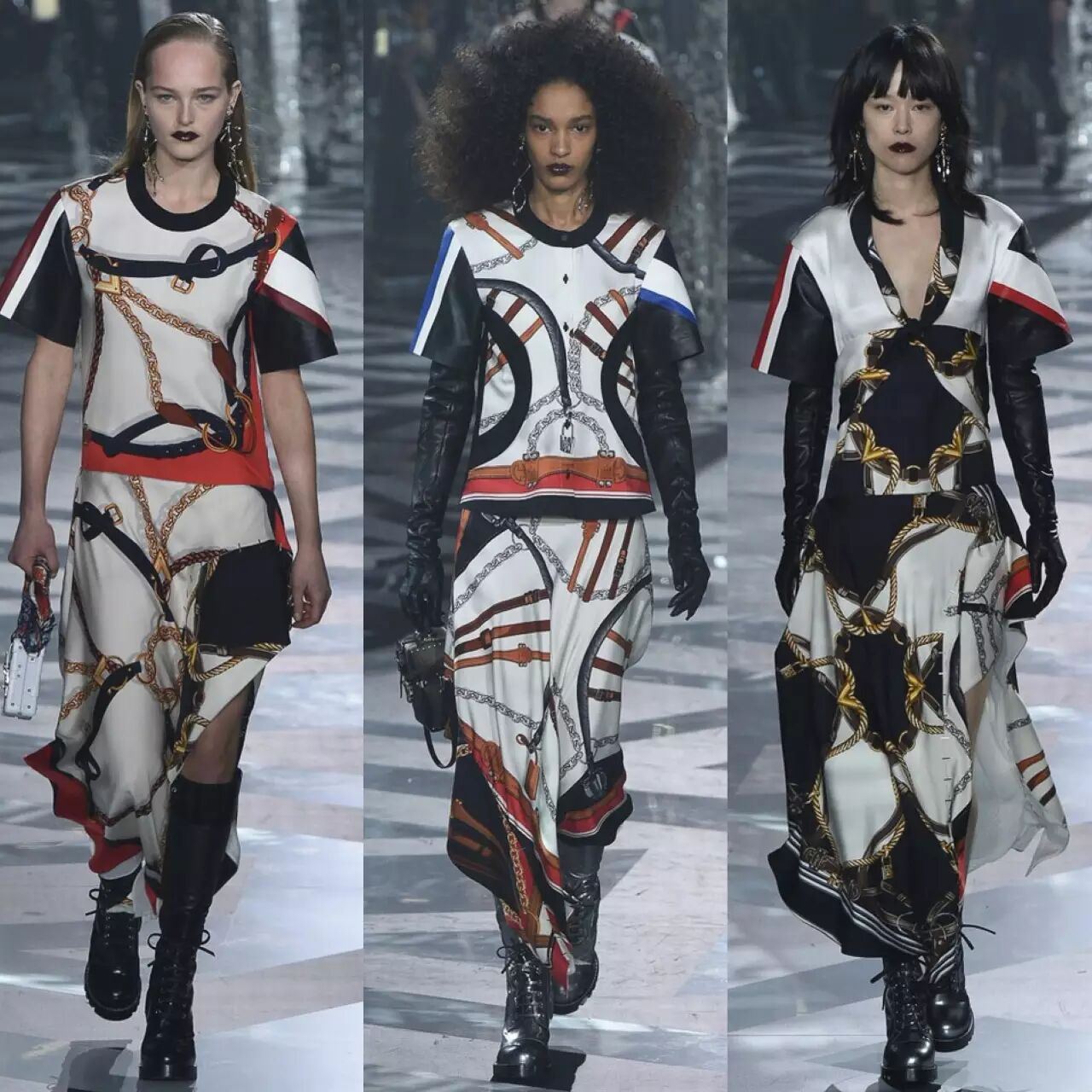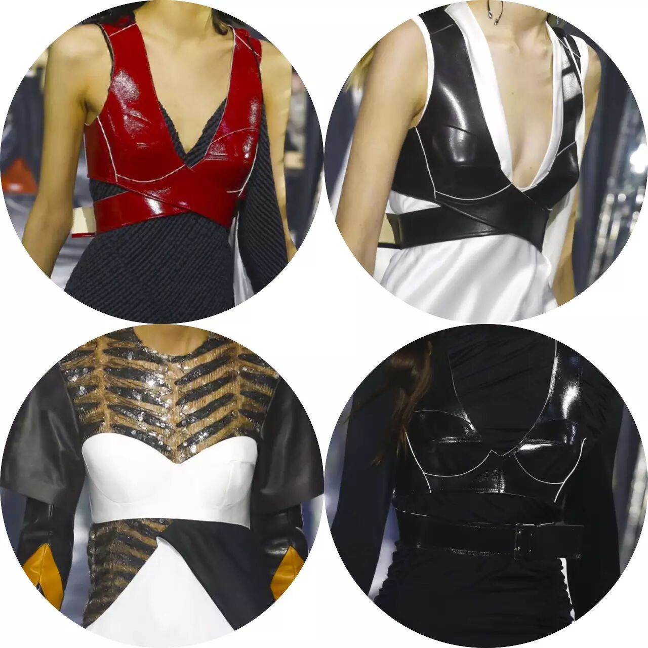 这次的设计中很多运用到了盔甲胸衣的元素,亮皮v领低胸衣硬朗而不失性感,Louis Vuitton的女战士准备好去打仗了嘛!