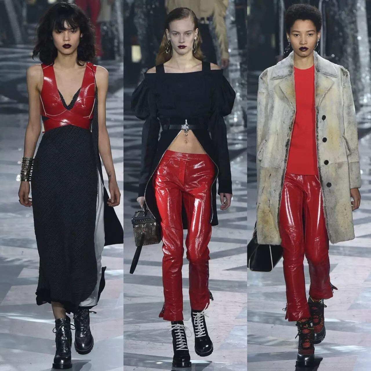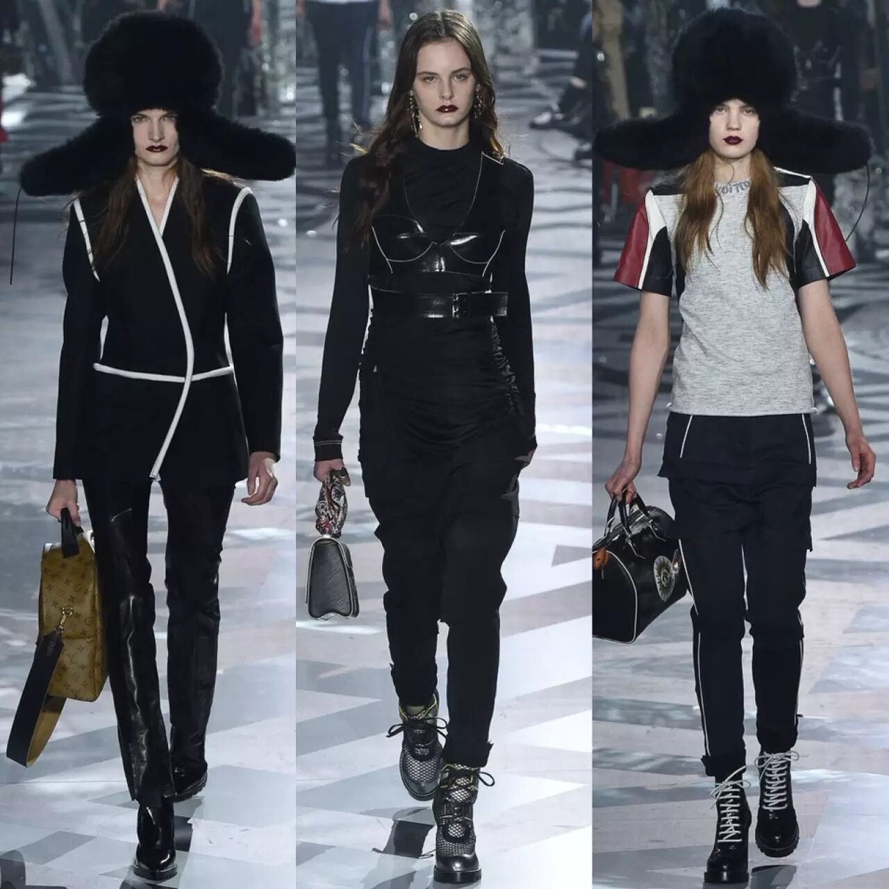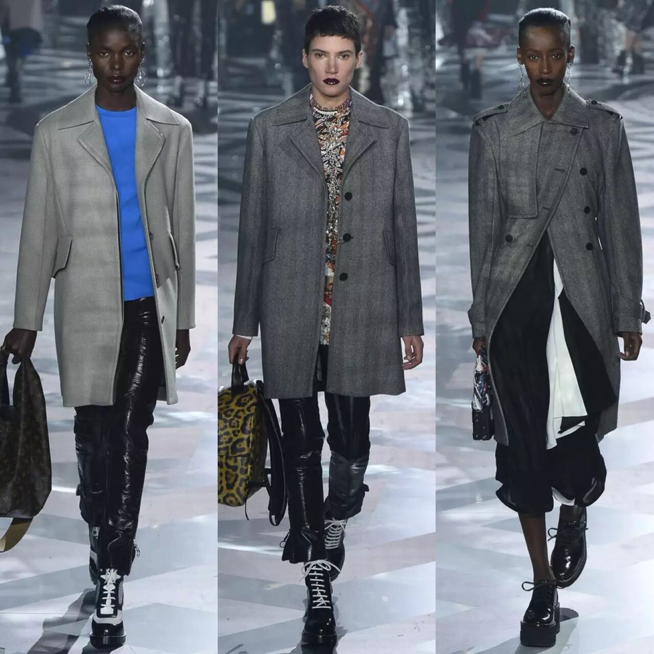 短款皮衣,马丁靴,皮裤,廓形的大衣外套,Louis Vuitton从来没放松过对酷型的把控,单品混搭的结合让柔情的硬朗无限拓展。