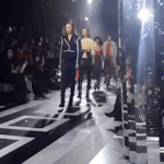 设计师一直思索应该如何把虚拟世界和真实世界联系起来,也许充满全身的抽象印花,颜色夸张艳丽的皮质套装与长裙针织衫的结合,就是他在这个秀场上给出的最好答案。