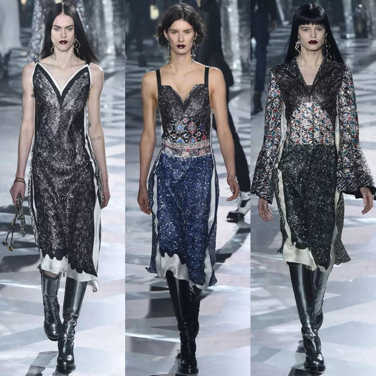 极具张力的塑身款式与高傲的冷街妆容结合出一种充满“未来主义感”的张力,时下流行睡裙的设计像盔甲一样贴合身形,也不再是一般的通俗性感。Louis Vuitton成功的为品牌树立起一个全新的当代形象。