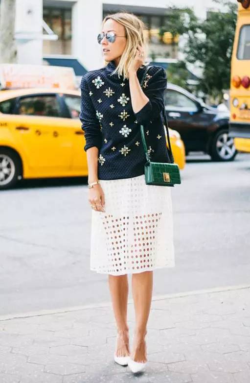 衬衫搭配裙装,再搭配裸色高跟鞋。