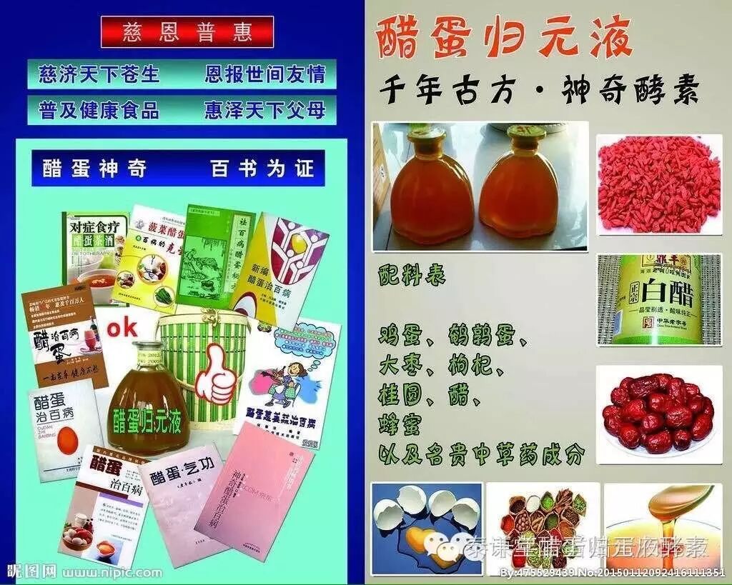 中医食疗 方法历史悠久,源远流长,1800年前医圣张仲景在《伤寒杂病论》中所创的醋蛋疗法,为很多中医和养生专家所推崇!我国是世界上最早使用醋蛋疗法的国家。醋蛋液配方的广泛应用,使一批被病魔折磨得痛苦不堪的人恢复了健康。经过一千多年的实践检验,醋蛋疗法对于以下70多种疾病,都有很好的调理作用,西安恩惠生物科技有限公司的醋蛋归元液是在我国千年古方:醋泡鸡蛋的基础上加入:鹌鹑蛋、大枣、枸杞、桂圆、蜂蜜及各种名贵中药材,经过特殊工艺发酵,成为复合性“酵素”,醋蛋归元液里含活性酶、转移酶、顶体酶、鸟甘酸环化酶、前列腺腺体酶等100多种人体必需的酶,经国家权威机构中科院检测醋蛋归元液含有多种复合酵素,胆碱,氨糖,低聚糖等多种人体健康不可缺少的成份!是迄今为止发现的酶的种类最多,功能最全,效果最好的复合生命酵素。在市场上是独一无二的酵素产品。