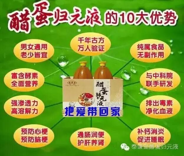 如今,西安恩惠公司一一泰谦堂将这一偏方发扬光广,研发生产出了更具魅力的产品一一醋蛋归元液