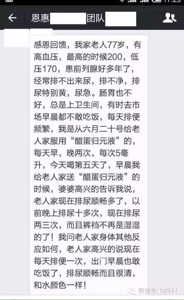 1.感恩回馈,我家老人77岁,有高血压,最高的时候200,低压170,患前列腺好多年了,经常排不出来尿,排不净,排尿特别黄,尿急。肠胃也不好,总是上卫生间,有时去市场早晨都不敢吃饭,每天排便频繁,我是从六月二十号给老人家服用“醋蛋归元液”的,每天早,晚两次,每次5毫升,今天喝第五天了,早晨我给老人家送“醋蛋归元液”的时候,婆婆高兴的告诉我说,老人家现在排尿顺畅多了,以前晚上排尿十多次,现在排尿两三次,而且裤裆不再是湿湿的了!我问老人家身体其他反应如何,老人家高兴的说现在每天排便一次,出门早晨也敢吃饭了,排尿顺畅而且很清,和水颜色一样!