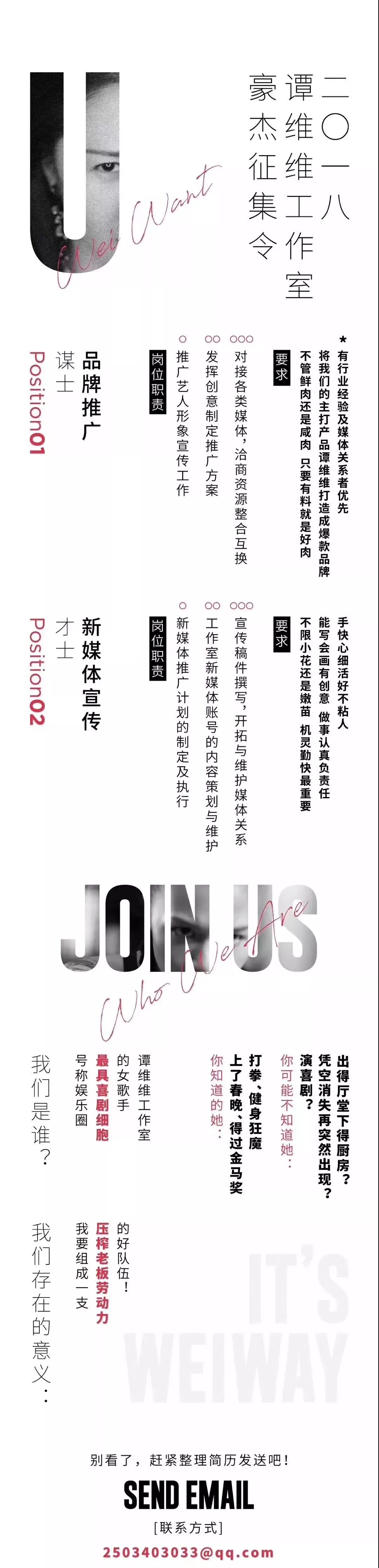 谭维维工作室豪杰召集令 | 整理简历,2018一起来战! 贵圈招聘 内地女星 2018-02-24 13:27:54 305 创作不易,用心坚持,欢迎请BaGua喝几杯爱心咖啡!打赏并支持本文 打赏并删除本文 招聘单位:谭维维工作室招聘职位:品牌推广、新媒体宣传工作地点:北京应聘方式:[email protected] 招聘详情如下 独家分享娱乐圈招聘信息长按扫码关注我点击“阅读原文”,查看更多往期招聘 创作不易,用心坚持,欢迎请BaGua喝几杯爱心咖啡!打赏并支持本文 打赏并删除本文 感谢您的支持鼓励,我会继续努力的!文章地址:用户邮箱:打赏金额:USDT 请输入数字点击”去打赏“,即可进行打赏支持本文章哦 谭维维 About the Author 贵圈招聘 功能介绍:每天告诉你进入娱乐圈的各种姿势!(独家一手的娱乐产业招聘信息)关注我,距离娱乐圈更进一步。 Related Posts 乐华娱乐大招聘!韩庚程潇孟美岐吴宣仪王一博范丞丞的公司 2019-02-22 18:41:27 姚晨公司坏兔子影业招聘资深艺人宣传! 2018-11-12 18:54:03 尚雯婕迪玛希公司 黑金音乐招聘经纪人、宣传、企划! 2018-10-06 13:05:08 黄小蕾公司统和天成影视招人啦!艺人宣传快到碗里来,等你加入喔~ 2018-09-17 16:15:12 黄英工作室招聘啦!脑洞大活又好的朋友看过来~ 2018-08-16 17:46:50 发表评论