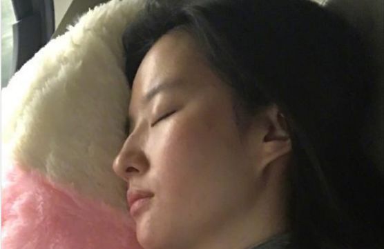 去年她有张坐车的素颜照,在微博疯传。照片中的她完全素颜,可能是太累了,抱着公仔睡着了,隐约还能看到下巴上有几颗痘痘。