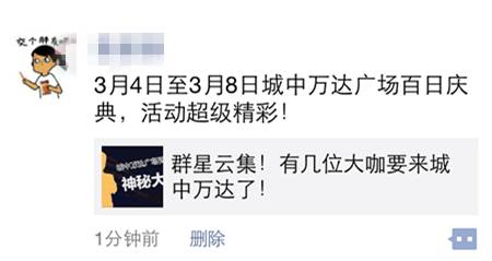 2、转发柳州城中万达广场微信平台“百日庆”活动微信头条并送上百日庆祝福语(一定要有百日庆的祝福语哦!),如:编辑“3月4日至3月8日城中万达广场百日庆典,活动超级精彩!”等文字进行转发。