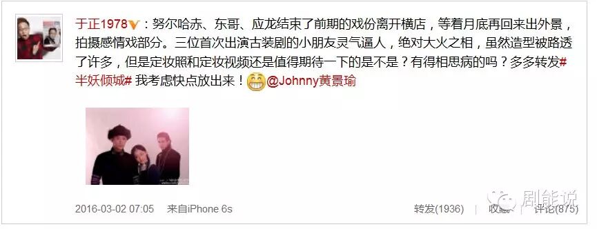 今天早上,于正晒出了黄景瑜的古装扮相型,照片上黄景瑜表情冷峻,被旁边的女演员搂住胳膊。