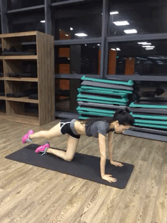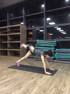 趴在瑜伽垫上,双臂支撑在地面。接着抬右腿向右上方弓腿,接着向后踢腿为一个动作,做20个为一组即可,这个动作既锻炼了大腿内侧又锻炼了大腿后侧。