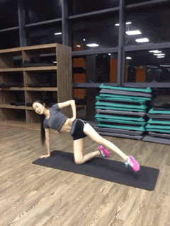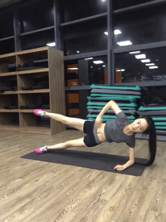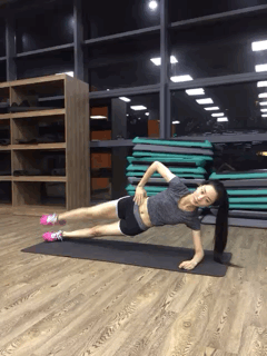 跟动作1差不多,同样是侧面的平板支撑,另一只腿侧抬即可,20个为一组,可以锻炼到大腿内侧肌肉。