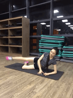 侧面趴在瑜伽垫上,一只手肘支撑在瑜伽垫上,另一只手扶在地面。贴近地面的一只腿做支撑点,另一只腿在空中做画圈的动作,整个大腿的肌肉都能锻炼到喔。