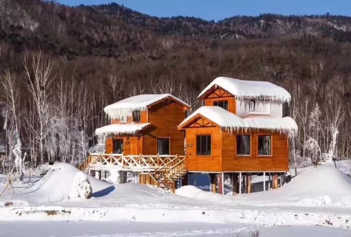 隆冬时节,来到这里,只见美丽的冰湖,悄然镶嵌在雪山、雾凇之中,冰湖旁边则是一片规划齐整的木屋,那便是记忆里乡愁的地方——冰湖雪村。
