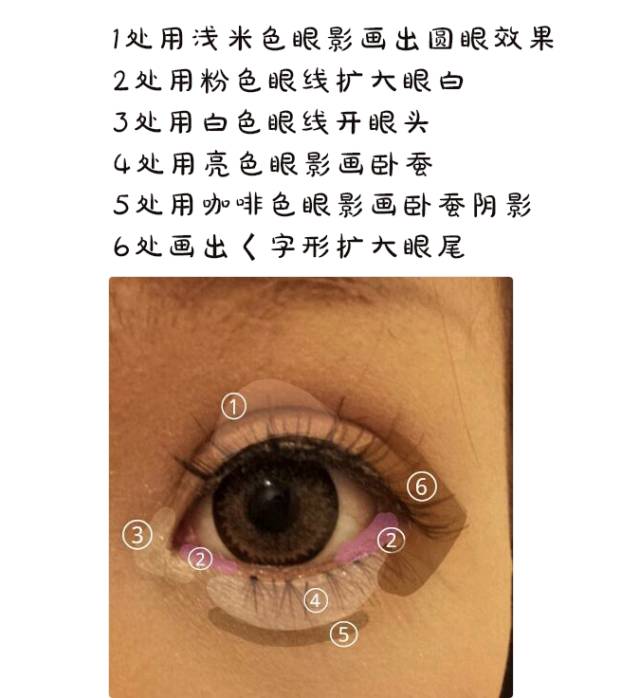 下垂眼线、饱满卧蚕、眼头提亮、眼尾涂白