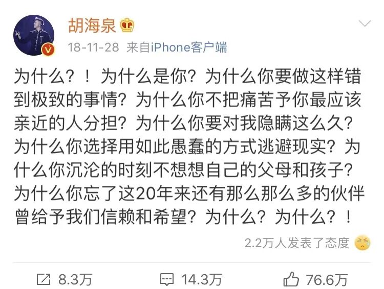 胡海泉更是第一时间发了一篇“十万个为什么”,震惊之情也溢于言表。
