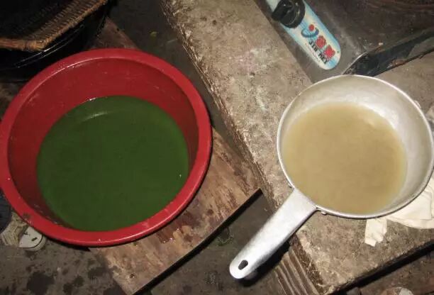 step5:过滤浆汁。找一块纱布放在干净的簸箕上,簸箕下放一个盆,将上述树叶浆汁全部倒入纱布中,纱布四角收拢,用力将里面的浆汁挤到盆中。直到浆汁全部过滤到盆中,“神豆腐”的主要原料就完成了。