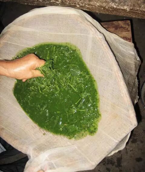 step4:揉挤树叶浆汁。叶子浸泡好后,用力揉挤树叶,使树叶浆汁与叶脉完全脱离。