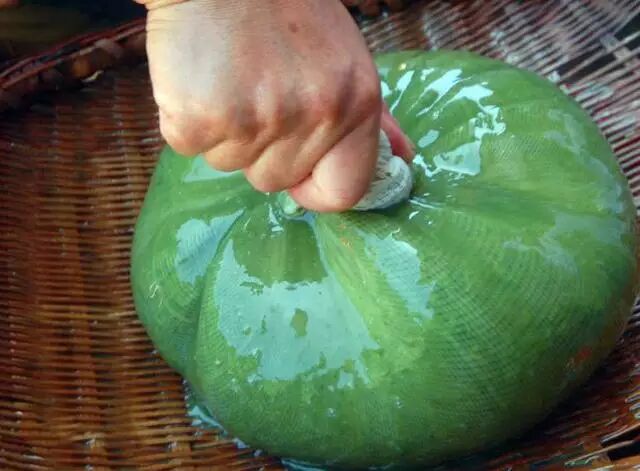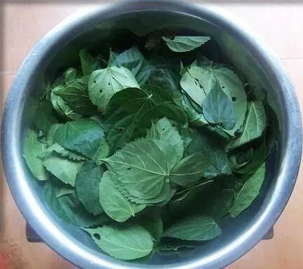 step3:开水浸泡。将洗净后的树叶放入一个大桶或大盆中,将适量的开水倒入其中,烫熟树叶,或者在大锅中烧好开水,倒入叶子烫熟。这样便于后面揉碎树叶,使树叶浆汁更好。