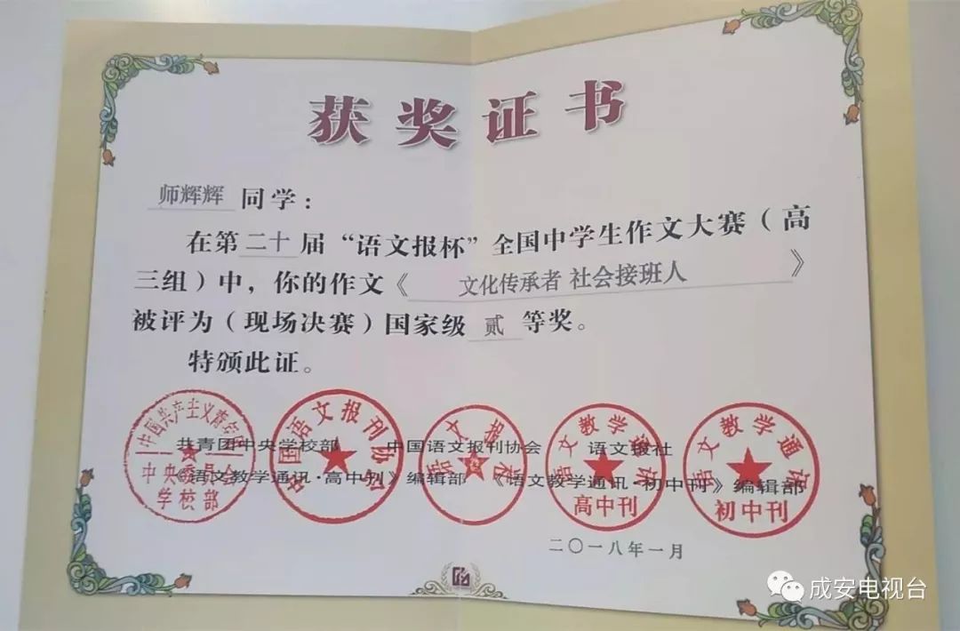 成安一中高三1班师辉辉同学在第二十届“语文报杯”全国中学生作文大赛(高三组)现场决赛中荣获国家级二等奖。