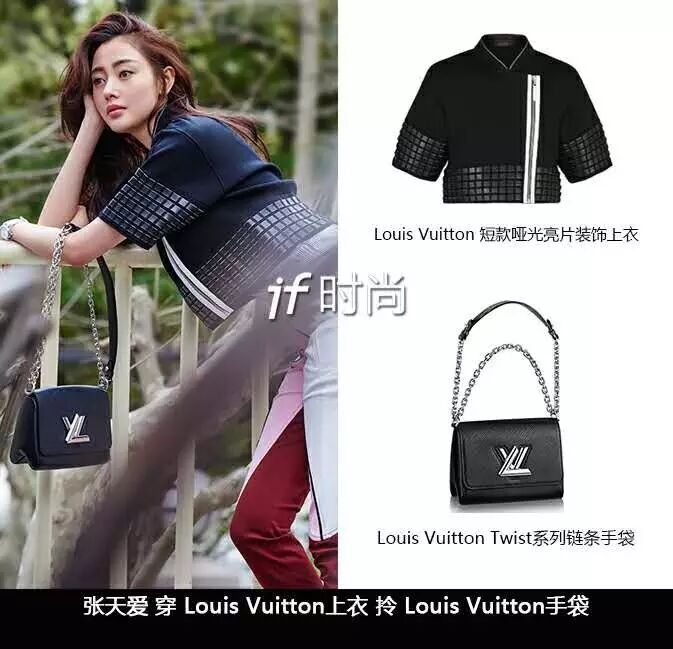 ▲亮片上衣及色彩拼接长裤来自Louis Vuitton,手拎Louis Vuitton Twist系列链条手袋。