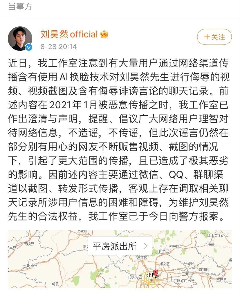 演员刘昊然报警! 极目新闻 内地男星 2021-08-29 14:19:58 788 创作不易,用心坚持,欢迎请BaGua喝几杯爱心咖啡!打赏并支持本文 打赏并删除本文 8月28日晚演员刘昊然工作室发布了一则报警声明引发网友关注↓↓工作室称,近期有大量网友通过网络渠道、利用AI换脸技术,传播对刘昊然带有侮辱性的视频、截图,同时还有含有存在诽谤言论的聊天记录。今年1月该内容被恶意传播之时,工作室已作出澄清与声明,但谣言仍然引起了更大范围的传播,产生了极其恶劣的影响。为维护刘昊然的合法权益,工作室已于28日向警方报案。刘昊然,1997年10月10日出生于河南省平顶山市,中国内地男演员,毕业于中央戏剧学院表演系本科 。2014年,主演电影《北京爱情故事》而正式出道,并凭借该片提名第21届北京大学生电影节最佳新人奖 。代表作品有:《最好的我们》《建军大业》《妖猫传》《琅琊榜之风起长林》《唐人街探案1、2、3》《我和我的祖国》《一点就到家》。面对铺天盖地、愈演愈烈的各种谣言,工作室为了维护刘昊然的合法权益选择报警,用法律途径来肃清这些不实内容。据悉,AI换脸技术日益发达,不少明星深受其害,刘昊然只是其中一个。近年来,刘昊然一直深受困扰,有粉丝顺藤摸瓜,找到造谣时间是在2019年,源头是外网。有博主利用人工智能对刘昊然进行了换脸,之后网友传播到各大网站,再加以文字渲染,各种流言蜚语接踵而至。如今,工作室以报警的方式来为刘昊然发声,在一定程度上也是为那些饱受AI换脸造谣的无辜受害者做出了示范。对此不少网友表示认为互联网并非法外之地传播谣言应该负担起相应的法律责任也有网友认为法律应该严惩那些利用AI换脸技术做着有违法律、道德之事的人作为网友我们需要理智吃瓜明辨是非,不传谣、不信谣同时,遵守网络规则不做谣言的捏造者来源:新晚报综合北青网、盖饭娱乐编辑:黄琳 创作不易,用心坚持,欢迎请BaGua喝几杯爱心咖啡!打赏并支持本文 打赏并删除本文 感谢您的支持鼓励,我会继续努力的!文章地址:用户邮箱:打赏金额:USDT 请输入数字点击”去打赏“,即可进行打赏支持本文章哦 刘昊然 About the Author 极目新闻 功能介绍:湖北发行量、影响力最大的纸媒,每天给你传递最新鲜、最实用、最好玩的资讯. 官方认证:湖北日报传媒集团(湖北日报社) Related Posts 资深导演突然离世!曾与秦汉、林青霞等人合作 2022-04-06 17:28:23 梁静茹承认离婚!称已签完离婚协议书,背后原因到底是什么? 2022-01-25 14:36:42 胡海泉出事了? 2021-12-02 21:41:58 张钧甯紧急发声:我不是“台独” 2021-09-07 14:52:50 演员刘昊然报警! 2021-08-29 14:19:58 发表评论