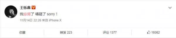 11月14日晚,王栎鑫通过微博为在台上太过紧张忘词而道歉,称:“我忘词了,唱砸了,sorry! ”