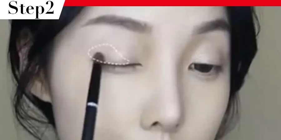 然后,在上眼尾虚线的位置涂上棕色眼影加深眼尾轮廓!