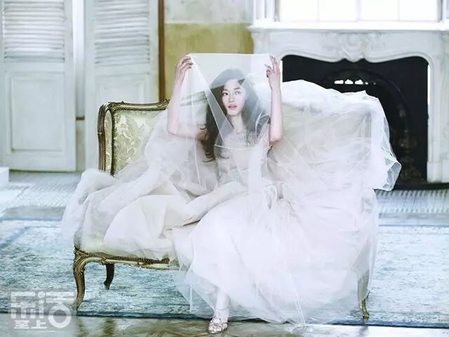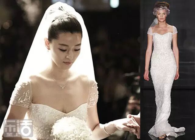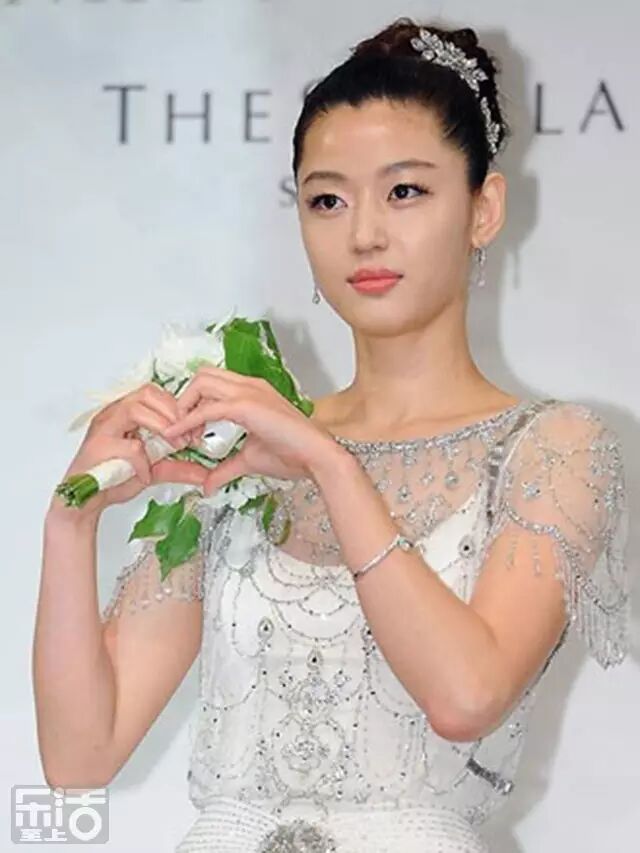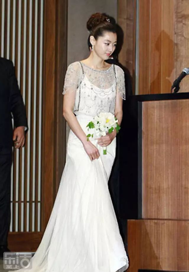 在婚礼上全智贤身穿奢华的Reem Acra的婚纱。