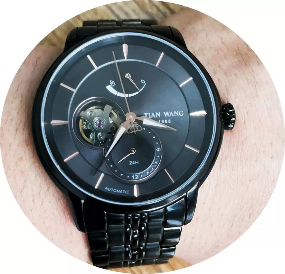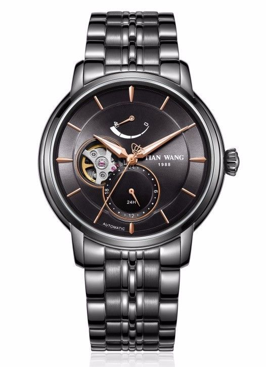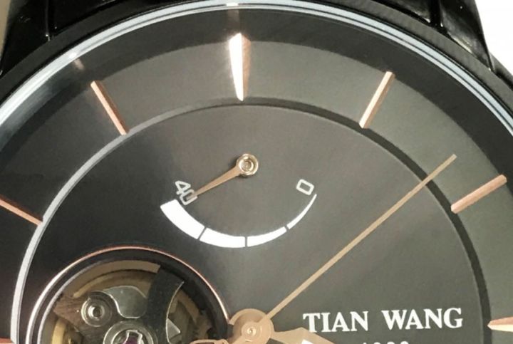 表盘:黑漆面表盘;指针为电镀玫瑰金色;24时盘和镂空盘外圈采用电镀圈装饰工艺。通过9时位置镂空窗,可以看到机械机心的避震器和摆轮