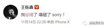11月14日晚,王栎鑫发微博为在台上太过紧张忘词而道歉,称:“我忘词了,唱砸了,sorry!”网友看到微博后纷纷留言安慰说:“唱砸了没关系,下次带上你的专辑证明你的实力。”