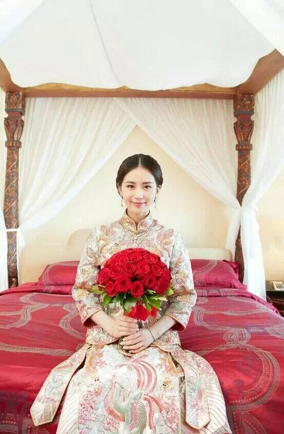 婚礼当天早上,诗诗穿的是传统的中式礼服。粉色与金色的搭配很少见,但特别美,喜庆又不俗气