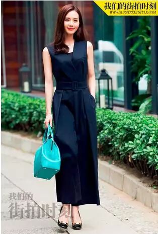 刘诗诗连体阔腿裤搭配浅口鞋,荧光蓝手包点整体搭配,轻熟感十足,OL职场范!