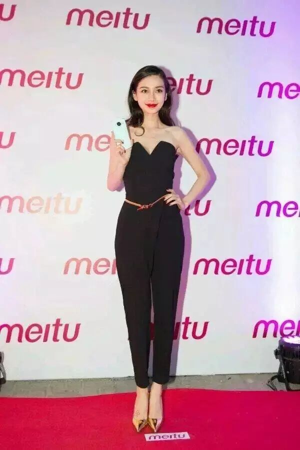 baby身着黑色抹胸连体裤,搭配金色尖头高跟鞋,大红唇、小v领,性感又时尚!