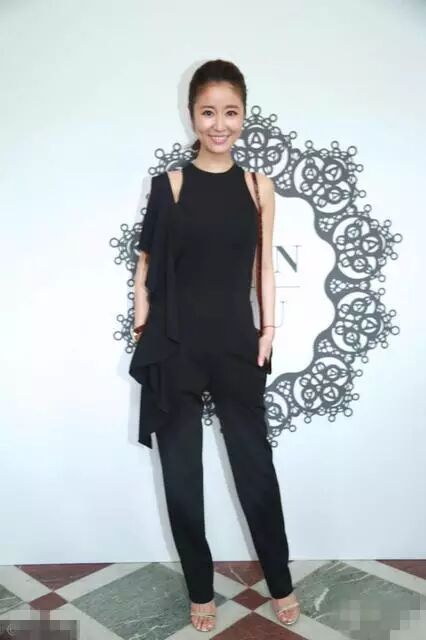 林心如露肩连体裤搭配一字带凉鞋,只有一侧肩上披披肩,打破对称设计,搭配马尾辫,时尚干练的同时又充满趣味。