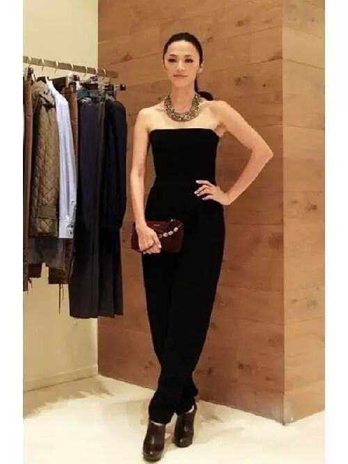 高圆圆抹胸连体裤,高跟鞋藏到宽松的裤摆中,非常显腿长,配合大背头,帅气女王范!