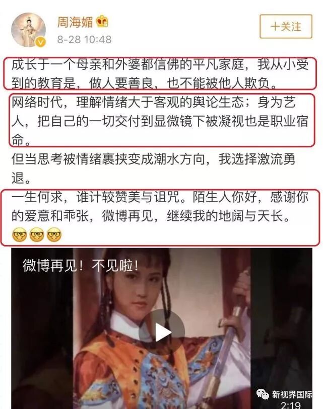 8月28日,周海媚宣布退出微博:从小接受教育就是做人要善良,但在网络时代却承受了不该承受的压力。这件事的起因还得从她饰演的电视剧《香蜜沉沉烬如霜》里的天后一角说起,因为这部剧正值热播期间,而她饰演的角色却又是一个内心矛盾的反派,但由于演技太过突出,某些网友针对她本人开启了“炮轰模式”,致使周海媚不得不退出微博。