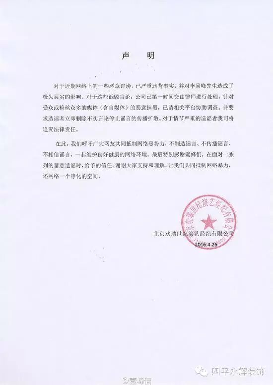 当日,李易峰公司欢瑞世纪发声明,表示近期网络上的一些恶意诽谤,已严重违背事实,并对李易峰造成极其恶劣的影响。对于诋毁言论,已第一时间交由律师处理,针对受众或粉丝众多的媒体(含自媒体)的恶意抹黑,已请相关平台协助调查,要求造谣者立即删除不实言论,停止谣言的传播扩散,对于情节严重的造谣者,将追究法律责任。(禾失)