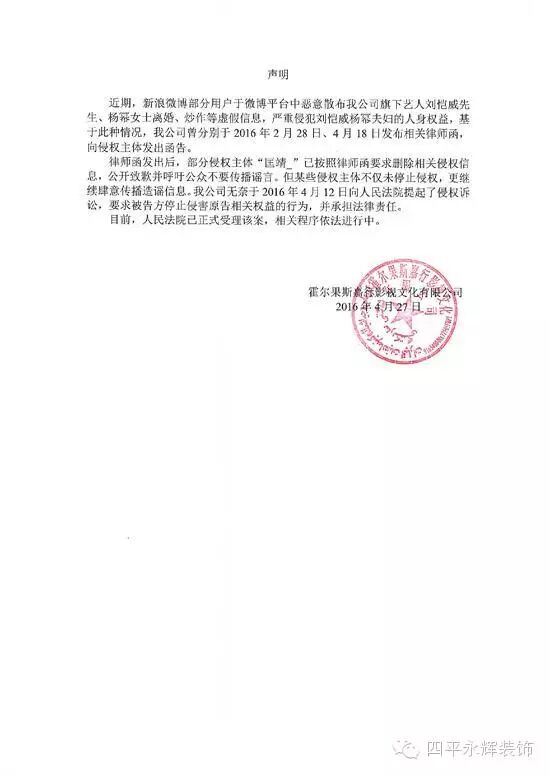 4月27日,嘉行影视公司在微博上公开发布声明,称针对旗下艺人刘恺威、杨幂夫妇的离婚传言,已发函向造谣者追究法律责任,目前,法院已受理案件,相关程序依法进行中。该声明中表示,公司于4月12日向人民法院提起了侵权诉讼,要求被告方停止侵害原告相关权益的行为,并承担法律责任。目前,人民法院已受理此案。
