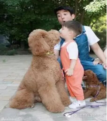好和谐的家庭画面。嗯哼和“大哥哥”泰迪亲嘴。站着的嗯哼还要站着挺直才比蹲着的泰迪高哦。这样的巨型泰迪,亲人一样的宠物,600万当然不卖
