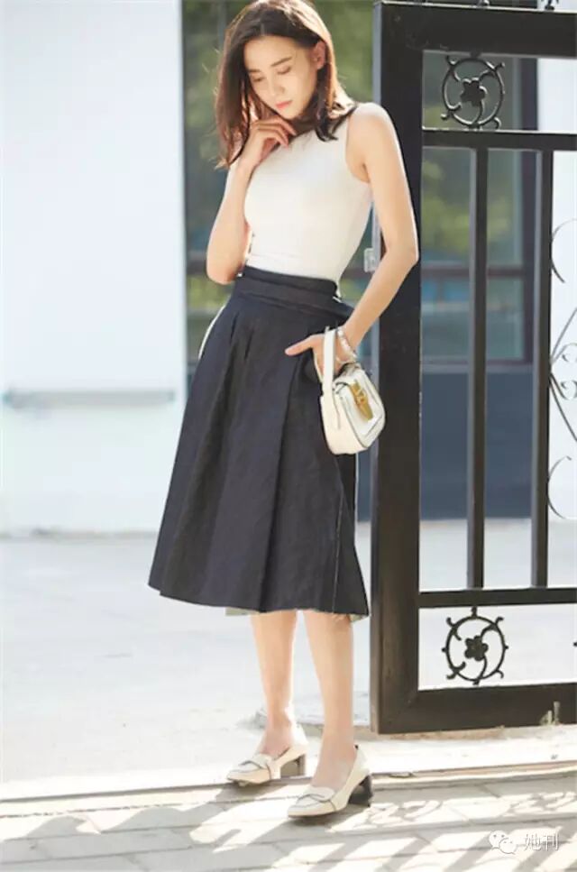 素颜出街买个菜都能上热搜的高圆圆,婚后的女神气质依旧不减。如果你也有着圆圆这样的长发,那么穿件垂感较好的深色无袖短T,搭配精致腰带和短款小白裙,春风吹来时,你的小肩一露,长发轻飘,你也能展露女神气质。