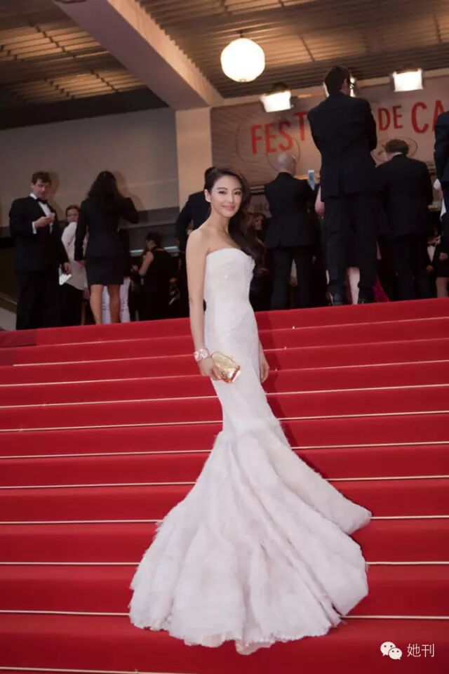 不论是这波浪形的抹胸礼裙,还是这白色长裙上,与鱼尾下摆相呼应的肩袖设计,都让“范爷”展示了她最妩媚又不失霸气的一面。